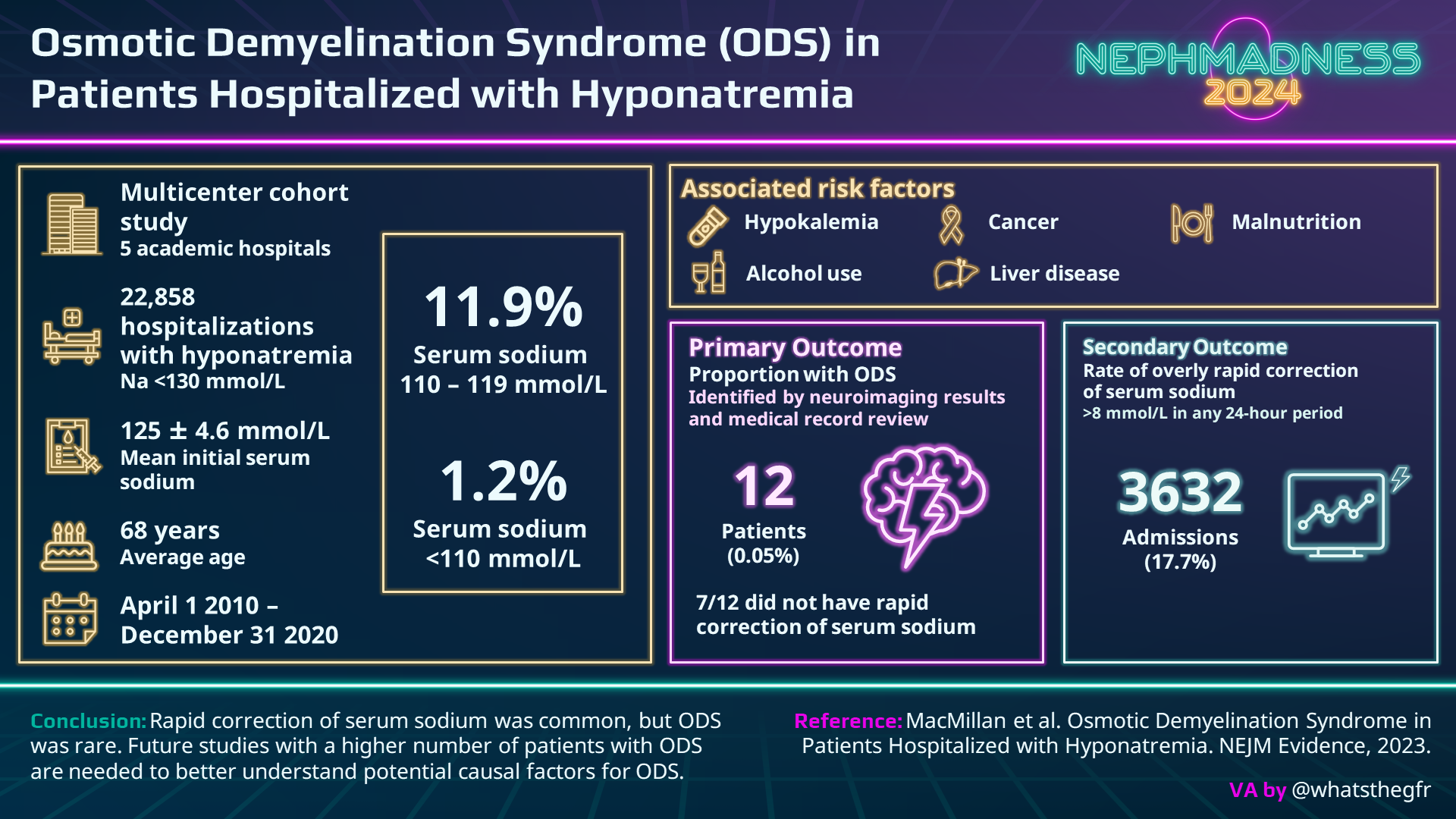 Enter the 2023 “disruptor paper” by MacMillan et al. This is an extremely large study of 22,858 admissions with hyponatremia, where 17.7% had a serum Na correction faster than 8 mmol/L in any 24-hour period, and the lowest Na group saw the highest risk of overcorrection. Patients with an initial serum Na <110 mmol/L underwent rapid correction 70% of the time compared with 46% of the Na 110-119 mmol/L group and 13% of the Na >120 mmol/L group. Nevertheless, even in the lowest Na group, ODS occurred in less than 1/1000. We must accept the potential for rapid correction in our patients despite best efforts. The possibility of ODS is certainly there BUT is it causal? In MacMillan et al.’s cohort, 7 out of 12 patients that developed ODS had hypokalemia, and a plurality had a positive alcohol level and a serum sodium <110 mol/L. The preponderance of high-risk patients in MacMillan’s ODS groups without clear relationship to the rate of correction should give us all a pause.