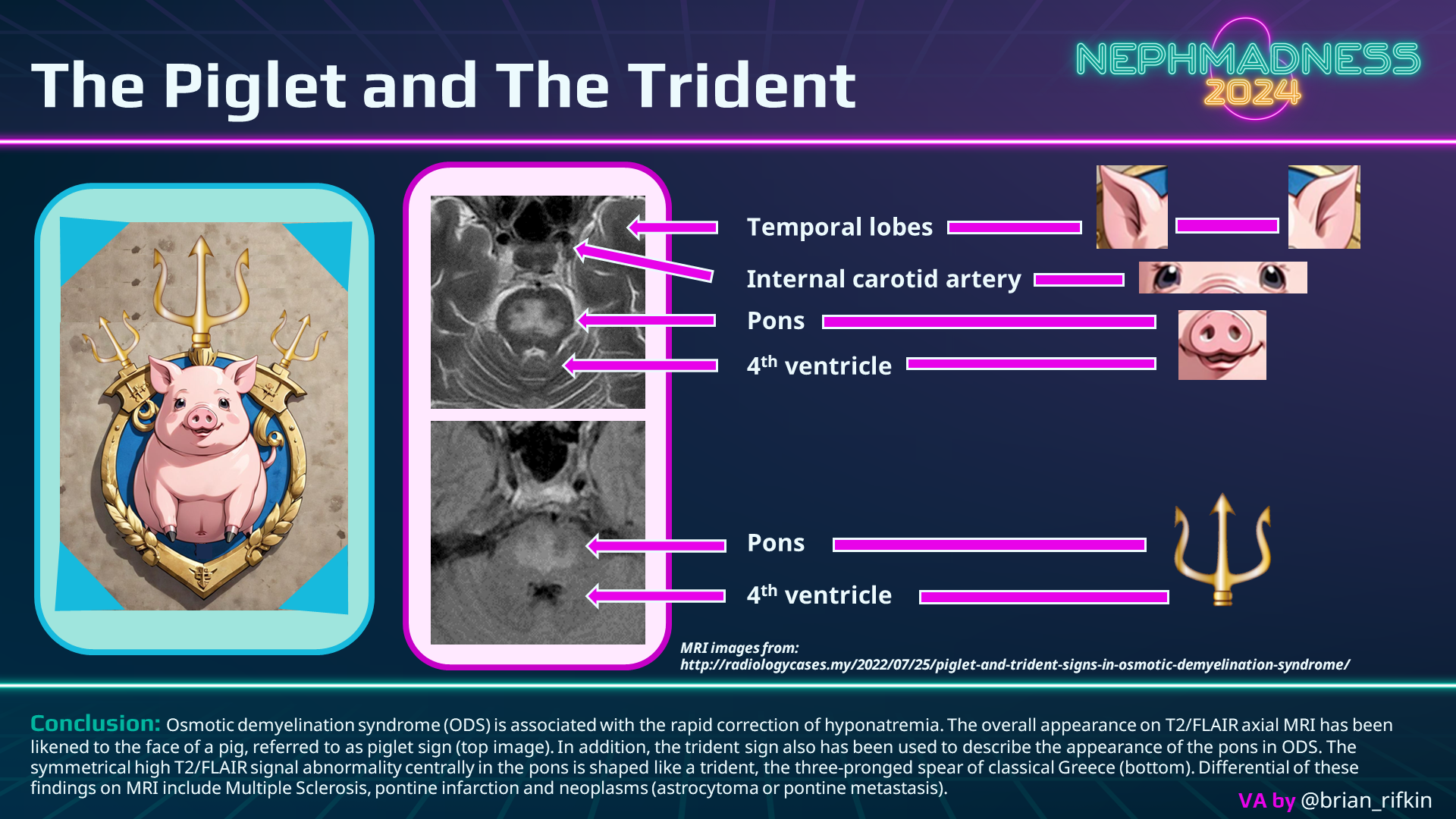 Clinical diagnosis relies on recognizing the characteristic presentation within the relevant context. While neuroimaging is used to confirm the diagnosis, it’s noteworthy that imaging findings may be delayed up to 3 weeks post the onset of the disease. In CPM, MRI reveals a “piglet” or “trident”-shaped lesion at the base of the pons (see graphic below), diffusion-weighted imaging may accelerate the diagnosis.