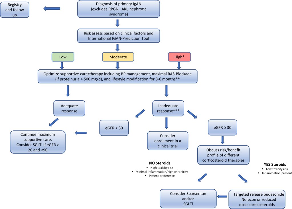 Caster and Lafayette synthesize all the recent advances in the treatment for IgAN with consideration of the risks and benefits of each treatment modality. In the figure below, they provide a potential treatment algorithm for IgAN.