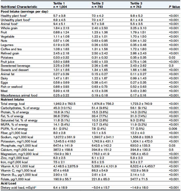 Nutritional Characteristics by Tertiles of the Overall Plant-Based Diet Index in the CRIC Study. Table 2 from Amir and Kim et al, © National Kidney Foundation.