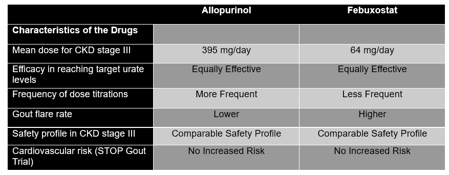 The STOP Gout Trial’s dynamic dose adjustment protocol offered a significant methodological advantage. This approach not only provided treatment flexibility but also yielded important empirical data. Notably, it demonstrated that patients with stage III CKD required mean doses of 395 mg for allopurinol and 64 mg for febuxostat to achieve target urate levels. These dosages were remarkably similar to those typically used in the general population, suggesting that moderate renal impairment may not substantially alter the dose-response relationship for these urate-lowering therapies. This finding has important implications for optimizing treatment strategies in CKD patients and potentially broadens the applicability of standard dosing regimens. Interestingly, data suggest that achieving equivalent serum urate control to target levels necessitated more frequent dose titrations for allopurinol compared to febuxostat. Goal achievement was similar between both groups and expectedly patients who did not meet the target were more prone to experience flares in the last phase. This trial, however, focused on patients with stage III CKD, limiting applicability to those with more severe CKD.