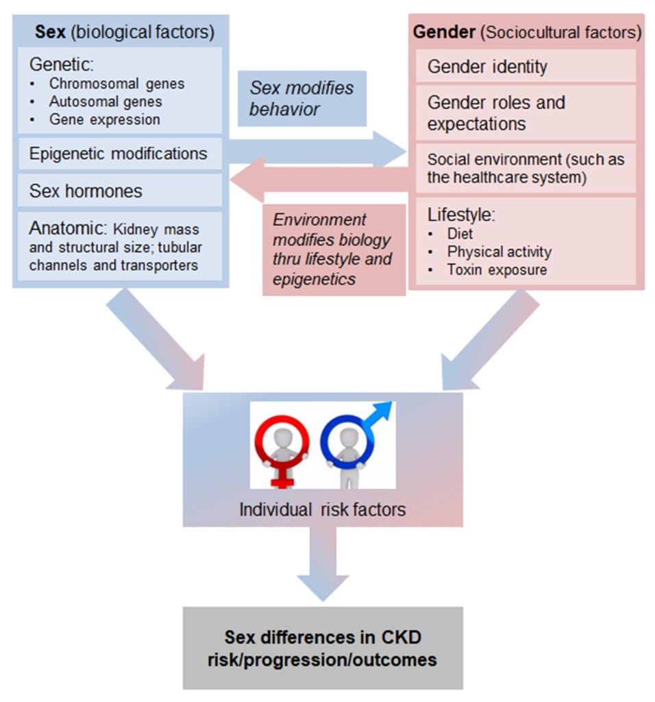 “Gender medicine,” a term first introduced in the late 1990s, is the study of how health is influenced by sex- and gender-based differences. Sex-based difference are biological and include differences in chromosomes, gene expression, and hormones. Gender-based differences are sociocultural and include differences in factors such as lifestyle, environmental influences and exposures, and sociocultural roles and expectations. Males/men and females/women have differing experiences of disease in a variety of domains including prevention, clinical manifestation, diagnostic and therapeutic approaches, prognosis, psychosocial effects, and interactions with the healthcare system. Sex and gender have a complex interplay, interacting, influencing, and even opposing each other to contribute to disparities between males and females in CKD risk, progression, and outcomes (Figure).