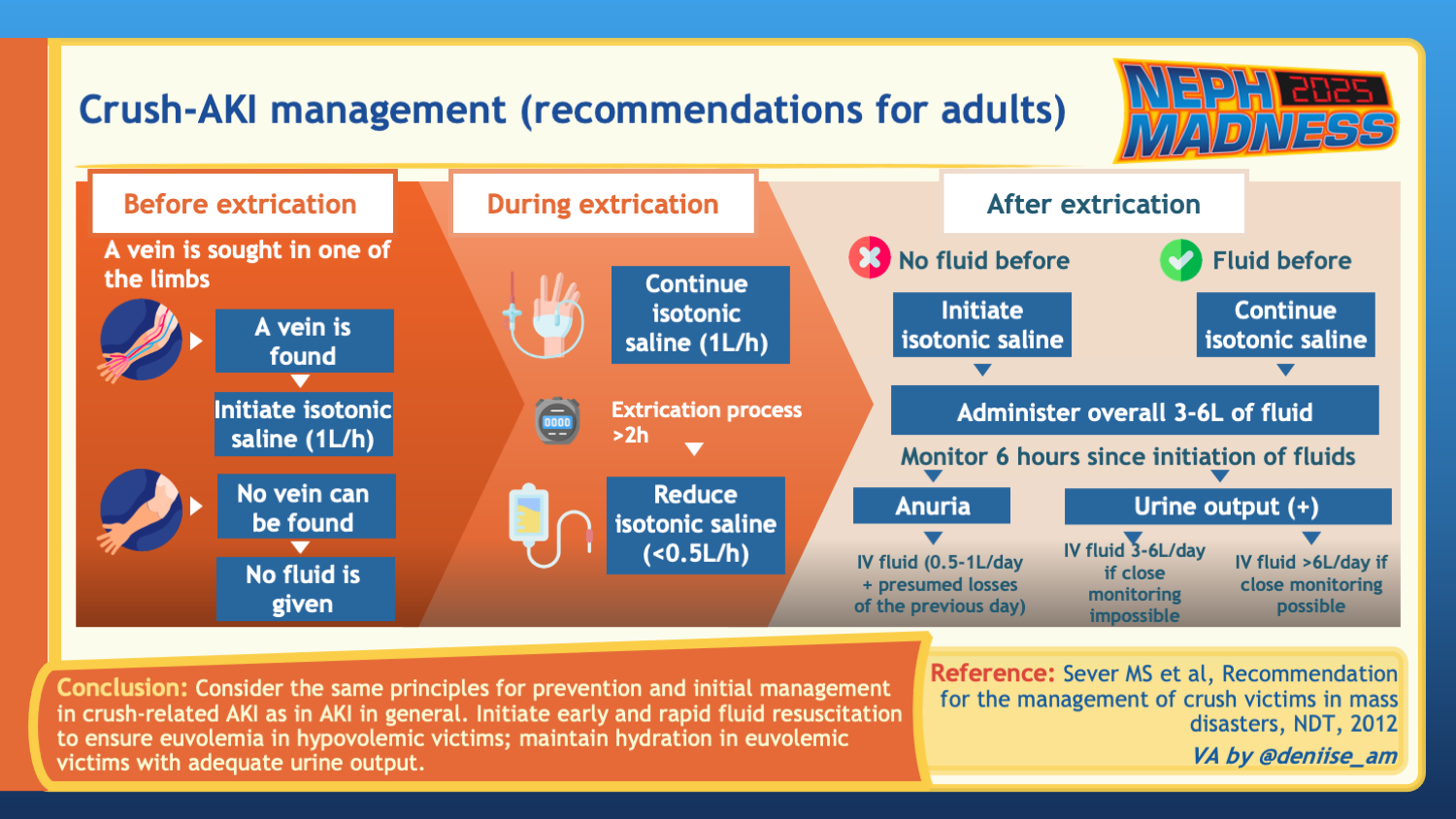 Management of crush-related AKI should begin even before the victim is extricated from the rubble. The cornerstone of treatment is early and aggressive administration of intravenous fluids, typically isotonic saline at a rate of 1 liter per hour. Monitoring urine output is essential to prevent hypervolemia. Fluids are later typically switched to a hypotonic-alkaline solution; potassium is empirically avoided. In the 1999 Bingol earthquake in Turkey, those who were aggressively fluid resuscitated were less likely to require dialysis. Intermittent hemodialysis is preferred over continuous renal replacement therapy or peritoneal dialysis for medical reasons (e.g., higher efficiency in treating hyperkalemia) and logistic reasons (dialyzing higher number of victims in a given time period).