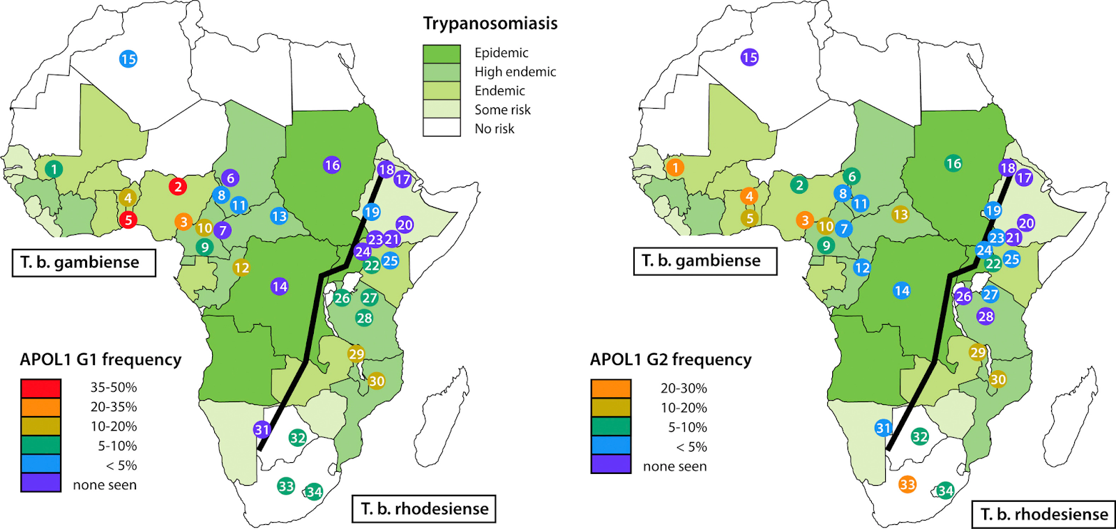 Geographic distribution of apolipoprotein L1 (APOL1) renal-risk alleles and Trypanosoma brucei subspecies. Shown are the distributions of (left) G1 and (right) G2 alleles among population groups, mostly in sub-Saharan Africa, together with the population ranges for T brucei gambiense and T brucei rhodesiense (ranges based on information from World Health Organization). The Great Rift Valley is shown as a line running from southwest to northeast. Fig 1 from Freedman et al, © National Kidney Foundation.