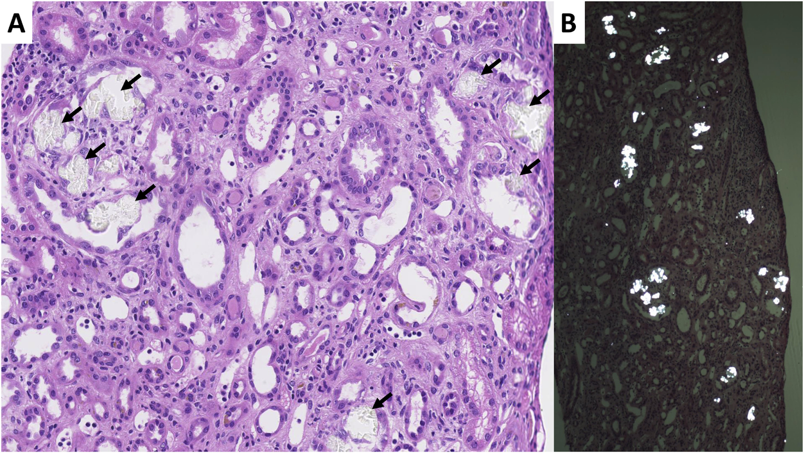 Oxalate nephropathy, kidney biopsy sample. (A) Intratubular translucent polyhedral or rhomboid crystals (black arrows) on light microscopy (hematoxylin and eosin stain, original magnification, ×20). (B) Crystals shown are birefringent under polarized light (original magnification, ×5). Biopsy also shows acute tubular injury and mild interstitial inflammation. Fig 4 from Demoulin et al, © National Kidney Foundation.