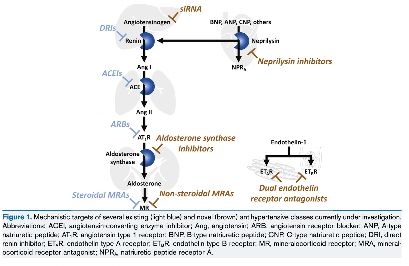 Mechanistic targets of several existing (light blue) and novel (brown) antihypertensive classes currently under investigation. Abbreviations: ACEI, angiotensin-converting enzyme inhibitor; Ang, angiotensin; ARB, angiotensin receptor blocker; ANP, A-type natriuretic peptide; AT1R, angiotensin type 1 receptor; BNP, B-type natriuretic peptide; CNP, C-type natriuretic peptide; DRI, direct renin inhibitor; ETAR, endothelin type A receptor; ETBR, endothelin type B receptor; MR, mineralocorticoid receptor; MRA, mineralocorticoid receptor antagonist; NPRA, natriuretic peptide receptor A. Figure 1 from Cohen et al, © National Kidney Foundation.