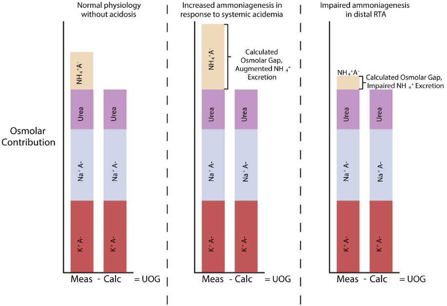 The urine osmolar gap in states of appropriate ammonium excretion and ineffective ammonium excretion. Figure 3 from Bonner et al, © National Kidney Foundation.
