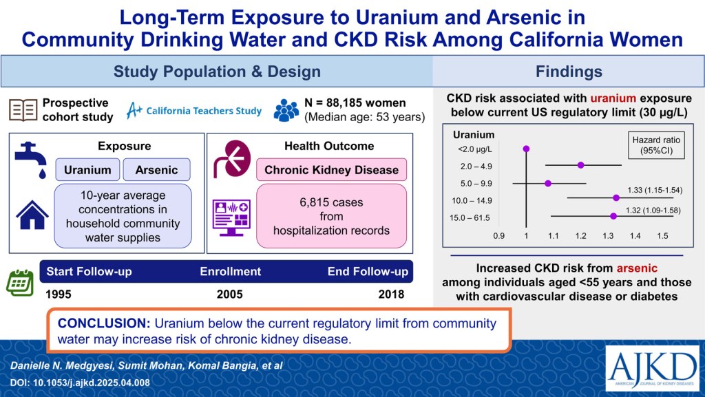 From the authors: Metals, including uranium and arsenic, can damage kidney function and may increase chronic kidney disease (CKD) risk. These contaminants are often present in groundwater and are regulated in US community water supplies. In a cohort of California women, we examined long-term uranium and arsenic exposure from households using community water. Higher uranium concentrations were associated with CKD. Those exposed to 10-15μg/L (or one-third to one-half the regulatory limit) had an approximately 30% greater risk compared with those below the World Health Organization 1998 guideline (2μg/L). Arsenic was not clearly associated with risk of CKD overall. However, we observed a higher risk among younger individuals and those who developed cardiovascular disease or diabetes. Uranium in community water may be linked to CKD, underscoring the need for further clinical investigation and policy evaluation.