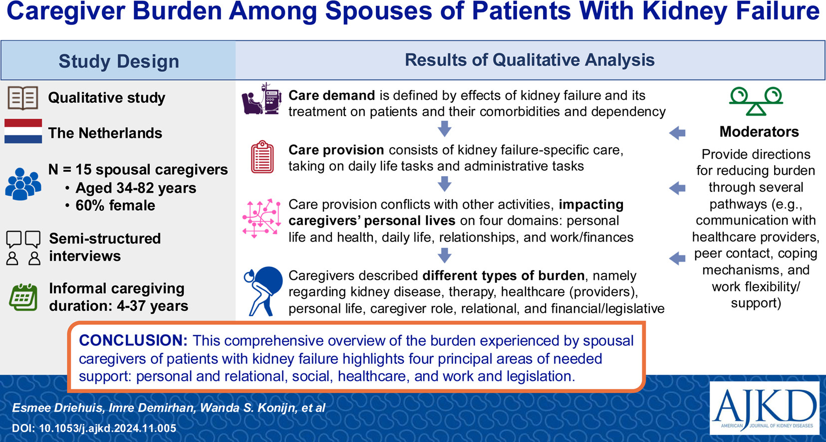 We have long known that dialysis caregiver burden is high and is associated with lower quality of life – making caregivers “hidden patients”. While as physicians we provide personalized attention to our patients, caregivers go largely unacknowledged. A recent qualitative study by Driehuis et al. in AJKD attempts to identify and describe the impact of this burden on caregiver lives so we might begin to address it more holistically. The researchers interviewed 15 informal caregivers recruited by the Dutch Kidney Patients Association and performed a directed qualitative content analysis using the stress-appraisal model of caregiver burden. The interviews revealed that caregiving for a loved one undergoing kidney replacement therapy (KRT) leads to substantial physical, emotional, relational, and financial strain. Caregivers often take on complex medical, logistical, and administrative tasks, while sacrificing their own health, careers, and personal lives. The level of burden varied based on dialysis modality (home vs. in-center), communication with healthcare providers, and availability of support. Caregivers report changes in their relationship with the patient from one of spouses to one of nurse-patient, decrease in physical intimacy, significant changes to their daily routine that impact their finances, careers, and other life decisions. Crucially, caregivers reported feeling invisible in the clinical process, especially during decisions about dialysis, which directly affected their lives. While the study provides an interesting insight into caregiver burden, it does have some limitations that need to be acknowledged; (1) limited sample size with only Dutch caregivers recruited, (2) demographics of patients who agreed to participate in video-taped interview, (3) undocumented reasons for declining study participation, and (4) different cultural expectations on caregiver roles/obligations – the study reports one in three Dutch adults provide informal care.