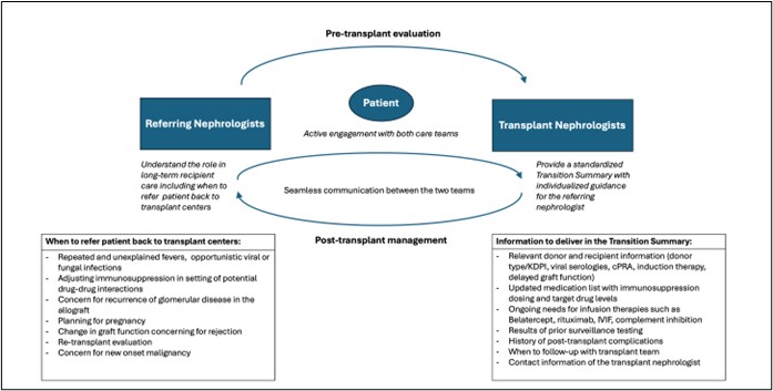 One key takeaway from the conference was that successful transitions depend on a clearly defined partnership between transplant nephrologists and referring nephrologists. Establishing a formalized, collaborative care framework improves recipient outcomes and enhances system efficiency by reducing complications. To achieve this, it is critical that referring nephrologists understand their role in long-term recipient care delivery, including monitoring immunosuppression, screening for comorbidities, recognizing complications early, and understanding when to refer the patient back to the transplant centers for transplant-specific complications. On the other hand, transplant nephrologists should provide the referring nephrologists a thorough, standardized transplant summary at the time of transition that details immunosuppressive history, complications to date, infection risks, monitoring guidance, and specific follow-up expectations. This communication should clearly delineate which aspects of care can be managed locally, when to involve the transplant team, and how to reach them for urgent concerns. The transplant team should remain readily accessible to both the patient and their general nephrologist for transplant-specific concerns that may arise after the transition of care (Figure 1).