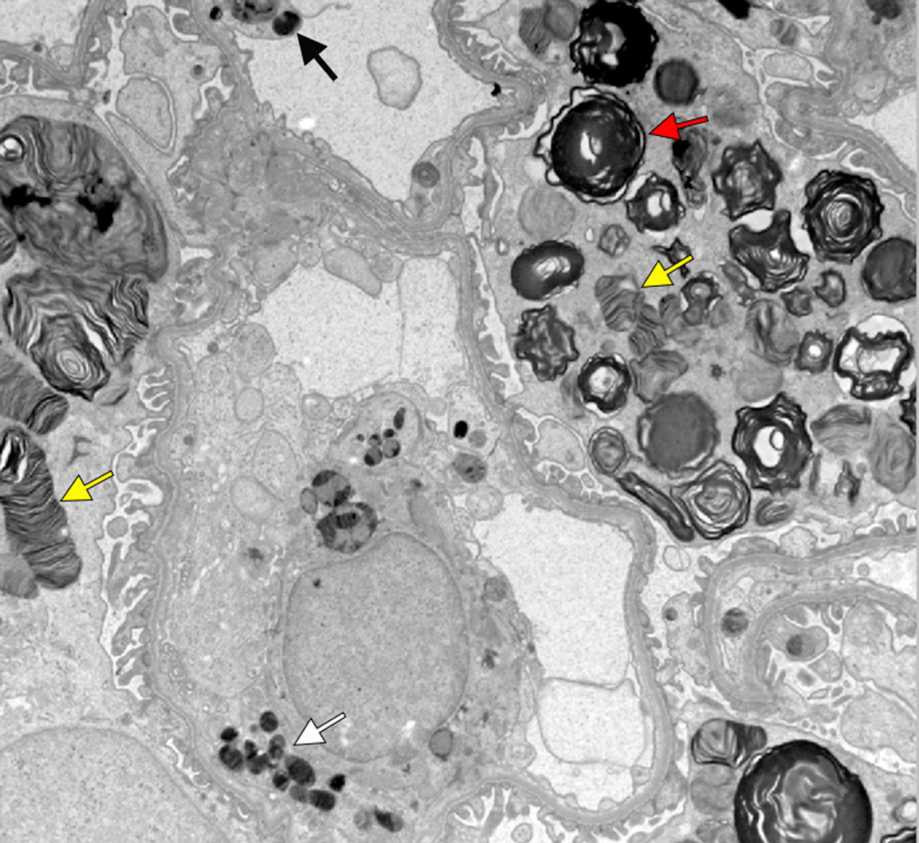 Fabry nephropathy with typical Fabry glycosphingolipid inclusions shaped as multilamellated myelin figures (red arrow) and zebra bodies (yellow arrows) in podocytes. There are also smaller inclusions in endothelial cells (black arrow) and mesangial cells (white arrow; electron microscopy).