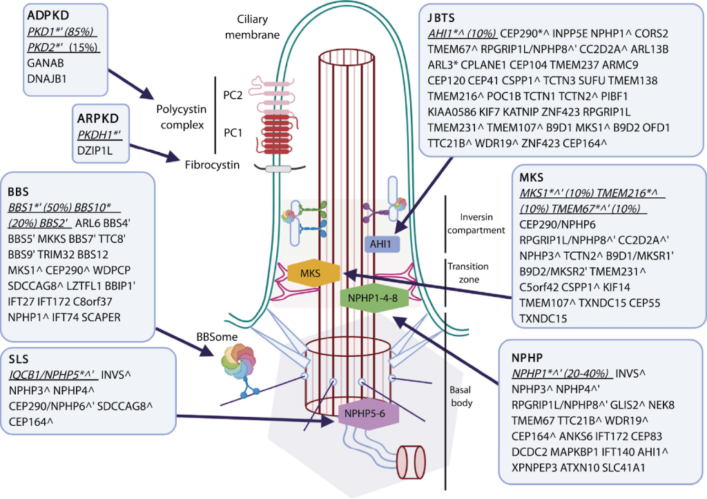 Figure: Renal ciliopathies and associated genotypes. The known reported genes mutated in the renal ciliopathies outlined in this review overlaid on a primary cilium schematic (see Fig 1). ∗Main associated genes. ˆMutated in another renal ciliopathy. ′Part of displayed protein/protein complex. Abbreviations: ADPKD, autosomal dominant polycystic kidney disease; ARPKD, autosomal recessive polycystic kidney disease; BBS, Bardet-Biedl syndrome; JBTS, Joubert syndrome; MKS, Meckel-Gruber syndrome; NPHP, nephronophthisis; PC1(2), polycystin 1(2); SLS, Senior-Loken syndrome.