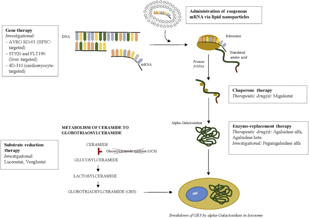 Figure: Current and investigational therapeutic agents for Fabry disease are depicted at each potential point of therapeutic intervention. As shown, therapies are directed at either replacing or generating deficient enzyme, or blocking the accumulation of substrate. Clinical trials with gene therapy approaches to the treatment of Fabry disease are ongoing. Chaperone therapy is now available for amenable mutation with migalastat. Enzyme replacement therapy remains the mainstay of treatment for most patients with Fabry disease, with agalsidase α and agalsidase β, while pegunigalsidase is in clinical trials. Substrate reduction therapy (SRT) consists of glucosylceramide synthase inhibitors and aims to reduce the accumulation of toxic substrate; SRT agents are currently in clinical trials.