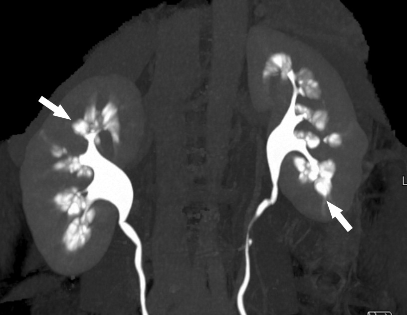 Figure Contrast-enhanced maximum intensity projection 3-dimensional image from multidetector-row computed tomographic urogram shows characteristic papillary blush (arrows) associated with scattered calculi within the dilated collecting tubules. The computed tomographic demonstration is equivalent to the well-documented intravenous pyelography findings.