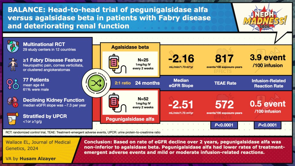 Pegunigalsidase alfa is a newer, pegylated ERT produced in plant cell cultures (tobacco leaves!) rather than traditional mammalian cells. Furthermore, this molecule is pegylated with a 2kda peg leading to a longer half life and potentially reduced immunogenicity. In a recent randomized trial, pegunigalsidase alfa showed reduced infusion=related reactions, and comparable results in efficacy when compared to agalsidase beta with respect to the primary endpoint of eGFR decline. However, long-term comparative outcome data (e.g. on ESRD, cardiovascular events) remain limited.