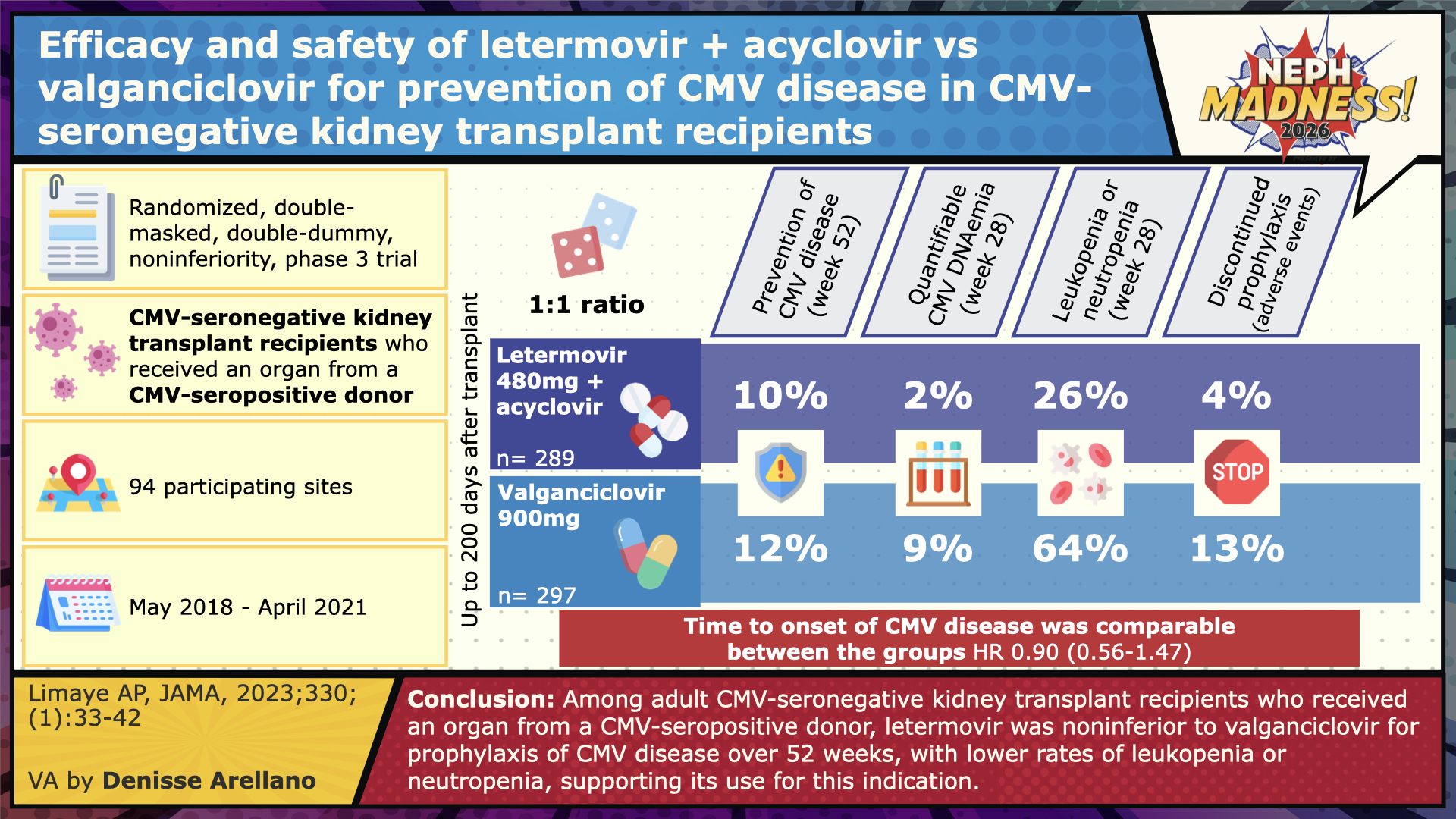 For universal prophylaxis, all patients are initiated on anti-viral drug for a finite duration post-transplant. For many years, valganciclovir was the MVP for prophylaxis due to its ease of oral dosing, potency and clinical efficacy. It is typically continued for 3 months in the intermediate-risk group and 6 months in the higher-risk group (D+/R-). The weakness of this player is its toxicities, particularly to the bone marrow; leukopenia often necessitates discontinuation of other important medications such as sulfa prophylaxis or mycophenolate. The fact is that very potent prophylaxis can delay but not prevent CMV disease, and in the absence of the individual’s development of CMV-specific immunity, pharmacologic prophylaxis has been described as the “kick the can down the road” approach. Because of these limitations, a new hot shot has recently joined this roster: letermovir, a viral terminase inhibitor, has demonstrated and was recently approved by the FDA for prophylaxis. This treatment is taking the league by storm. It can reverse the leukopenia seen with valganciclovir and prevent the reduction of mycophenolate associated with rejection. A 2023 study found that letermovir was non inferior to valganciclovir for prophylaxis of CMV disease, with lower rates of leukopenia. Additionally, it may allow more robust development of CMV specific cellular immune response. Letermovir does have an important handicap: it does not treat herpes and the addition of acyclovir or valacyclovir is necessary.