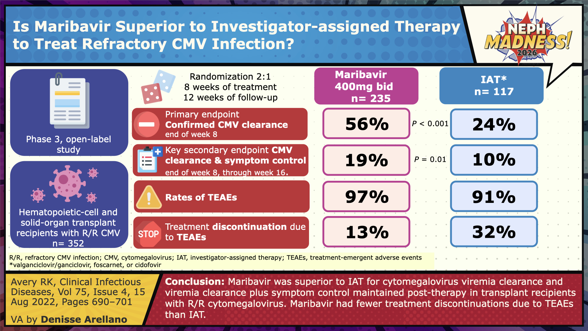 Cytomegalovirus (CMV, AKA human herpes virus 5), commonly known for the “owls’ eye” inclusion that can be seen on histology, is the most common opportunistic infection seen in kidney transplant recipients. Some may even call it the GOAT of herpes viruses given its propensity for genomic alterations which can make treatment of resistant CMV a real doozy. Prevention is key, but can also come at a cost. Sometimes CMV makes its presence clearly known, but like any good troll, it also knows how to be a menace in the dark.