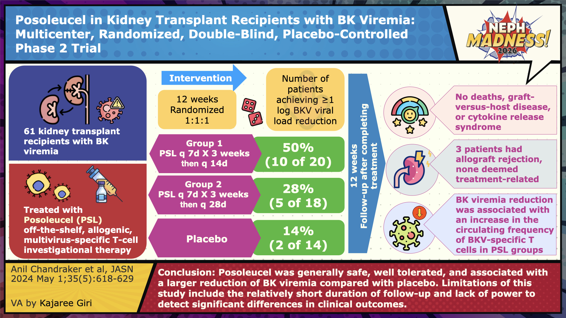 Beyond immune-based approaches, emerging therapies target essential components of BK virus replication, including agnoprotein (needed for critically important viral functions: assembly, maturation, and viral release) and viral mRNA splicing. There is more work to be done. Thirteen trials are actively recruiting patients with BKV, and include mechanistically promising studies of BKV-specific cytotoxic T-cells. Here’s to hoping that one of these treatments will eventually make it to the big stage to once and for all slay this pesky troll that loves to hideout – and until then, we’ll continue on with the KISS approach: keep it simple, stupid (and just lower the immunosuppression). But Team BKV is scrappy – just check out this Reddit thread titled “BKV Won’t Go Away.” Watch out for this yet-to-be-tamed opponent to steal this year’s NephMadness crown.