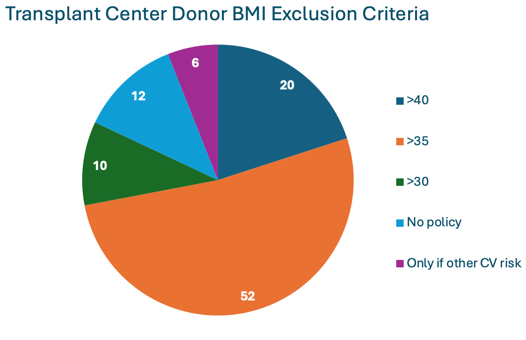 There is no standardized BMI threshold for donation. According to a 2007 United States transplant center survey, the majority of transplant centers excluded donors with a BMI >35 kg/m2