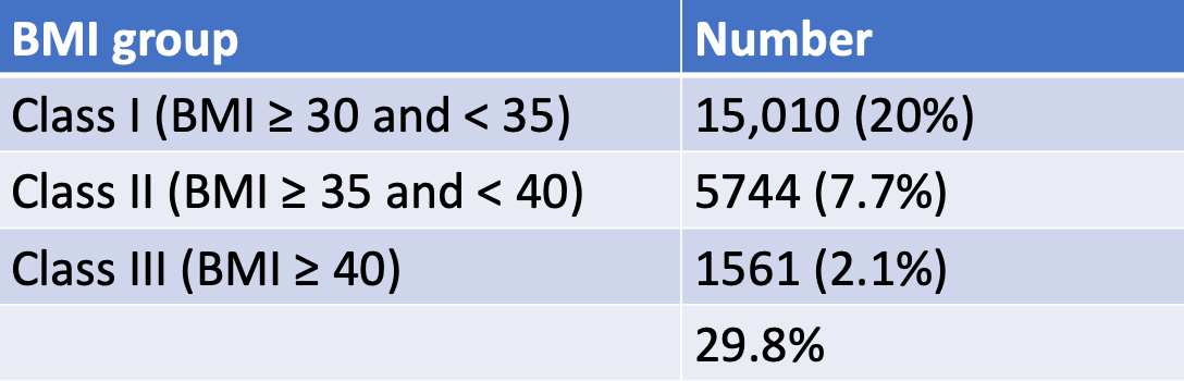It is well known that obesity is rapidly becoming a significant public health problem. Both the World Health Organization and the Center for Disease Control define obesity as a body mass index (BMI) ≥ 30 kg/m2. The prevalence of obesity in the United States is 40%.