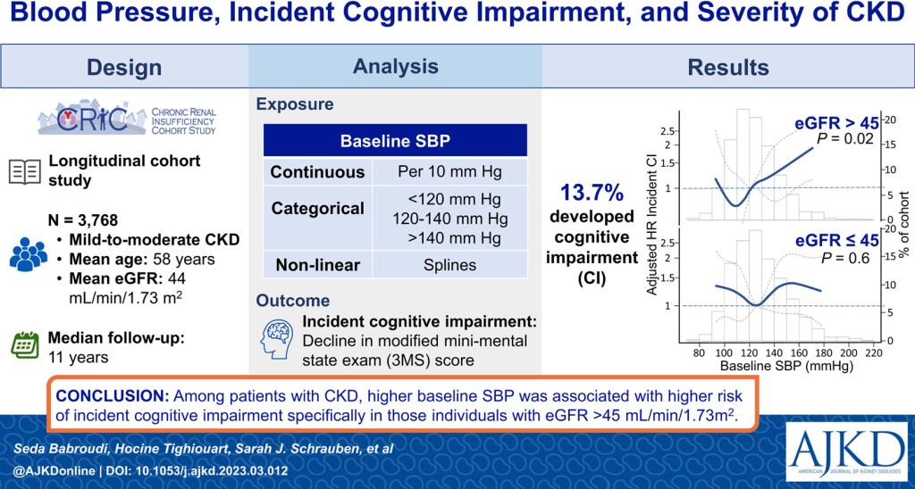 Hypertension in CKD has been linked to a higher risk of developing cognitive impairment. Within the CRIC cohort, patients with an eGFR > 45 mL/min/1.73 m² and elevated baseline systolic blood pressure were found to have an increased risk of developing cognitive impairment based on the mini mental status exam (MMSE). Even acute kidney injury (AKI) has been recently linked to increased risk of developing dementia and MCI. As part of a retrospective cohort analysis of the SPRINT trial, AKI was determined to be a risk factor for developing dementia even with the majority of patients recovering from the AKI. Collectively, these findings suggest that vascular injury may represent the common pathway linking kidney dysfunction to cognitive decline.